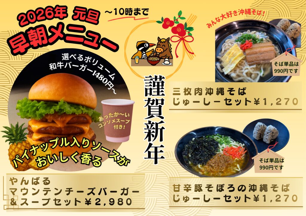 元旦は物販・カフェコーナーは15時までの営業します。カフェコーナーでは沖縄そば・焼きたてクロワッサンとコーヒーなど、ご用意しております。